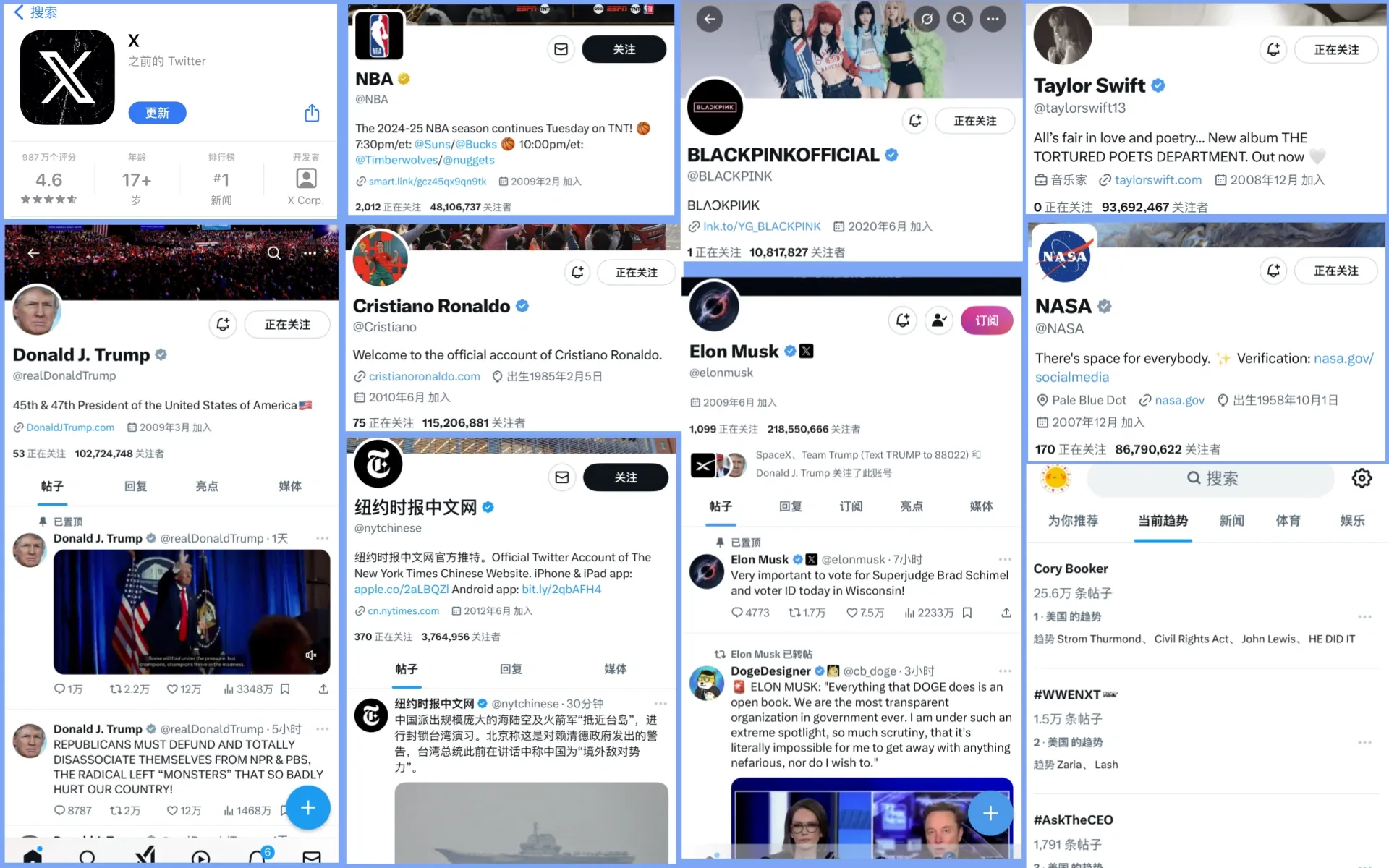- 媒体、政治人物、名人、组织机构……通常会使用X来发布信息。所以,如果你喜欢关注国际上的热门新闻、科技、政治、体育资讯……那就赶紧使用X吧;